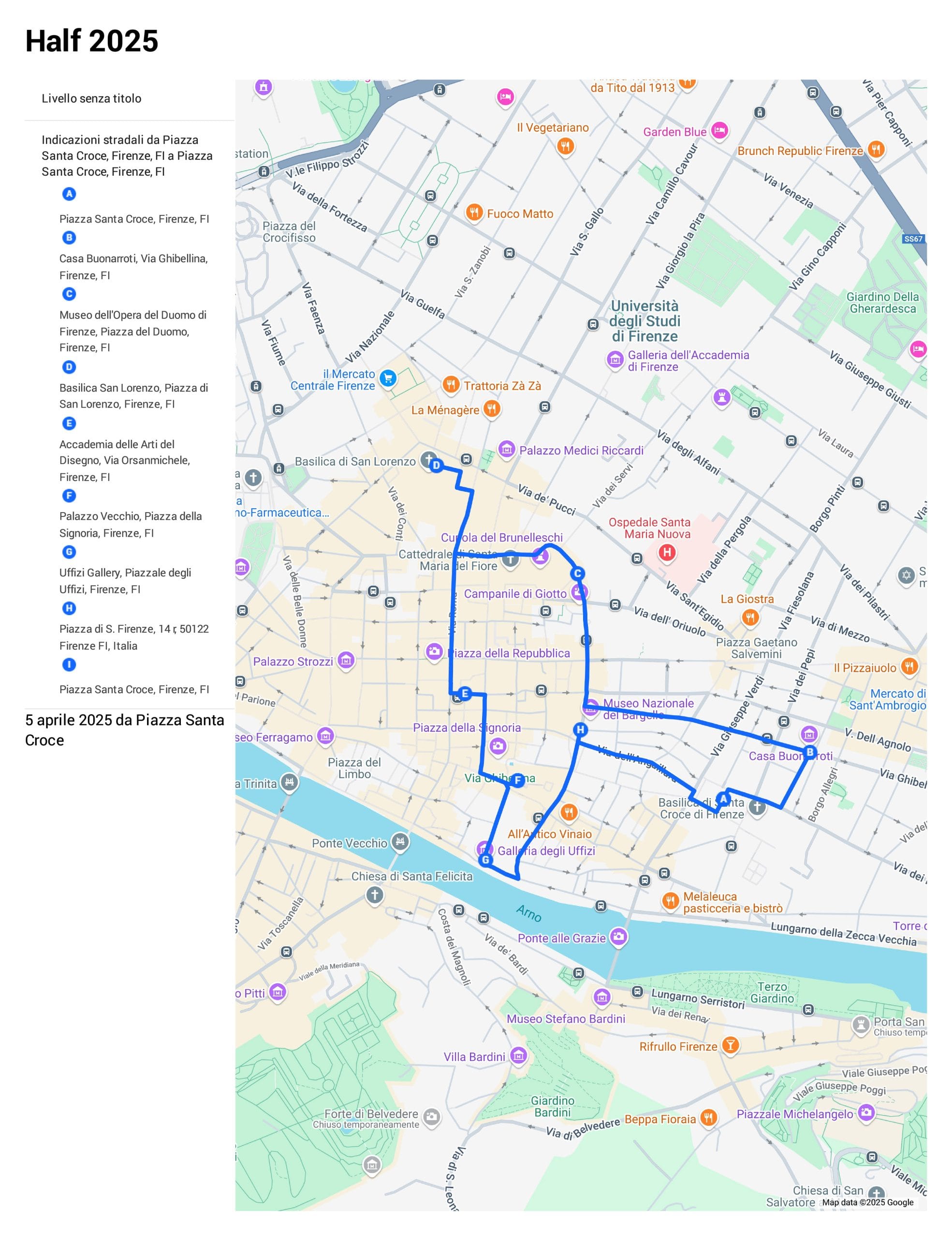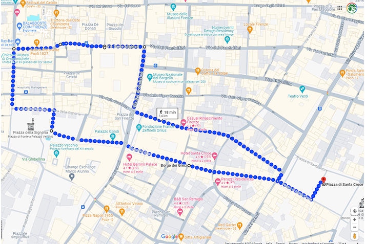 Borgo dei Greci → Via dei Gondi → Piazza della Signoria → Via dei Calzaioli → Via Orsanmichele → Via dei Tavolini → Piazza de Cimatori → Via Dante Alighieri → Piazza Santa Margherita → Via Dante Alighieri → Via del Proconsolo → Via dell’Anguillara → Rientro: Piazza Santa Croce
